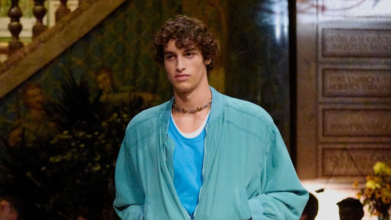 I’m not adding everything to cart just yet. Some of the tailoring veered into ’80s power suit costume, with stiff linebacker shoulders. The freshest and most appealing looks were the ones that seemed to fuse Gianni’s boldness with Vitale’s natural style sensibility. The contrasting, high-V-neck T-shirts poking out from under shirts and polos and sweaters? That was apparently all Vitale. “There was this rule when I was a kid that when you got dressed you always wore a T-shirt, a shirt, and a jumper,” he said. “So to me this is the fundamental of every wardrobe. I wanted to do something very sexy out of it. To do something that it’s so ordinary and classic and to make it sexy.”