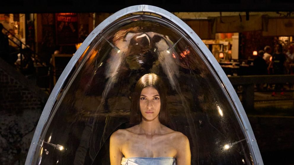 Instead of showing his looks on a closed runway, he took them to the streets. Diesel dressed 55 models and installed them in 34 “eggs”— large, open-backed oval vitrines—which were then distributed at locations around Milan (with the support of the city’s mayor). As Martens explained in a pre-hunt briefing, each egg was labelled with a QR code. He added: “The first five people who find all of the eggs will win a full look of their choice from the collection, tailored for them. And the second five will win any Diesel denim look of their choice. And then the next ten get to choose an accessory. And for anyone who wants to be part of it without going on the hunt, we’ll be having a party in Piazza Beccaria where everyone can come together. There’ll be a free concert and drinks. Cute huh?”