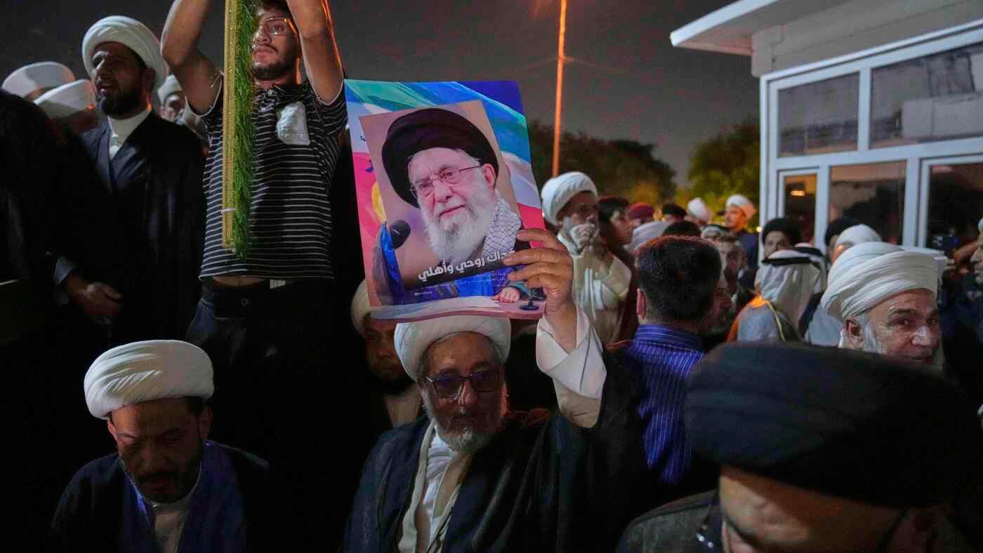 An Iraqi Shia cleric holds a portrait of Iran’s Supreme Leader Ayatollah Ali Khamenei during a protest against Israeli attacks on multiple cities across Iran, at a bridge leading to the fortified Green Zone where the U.S. Embassy is located in Baghdad, Iraq, Thursday.