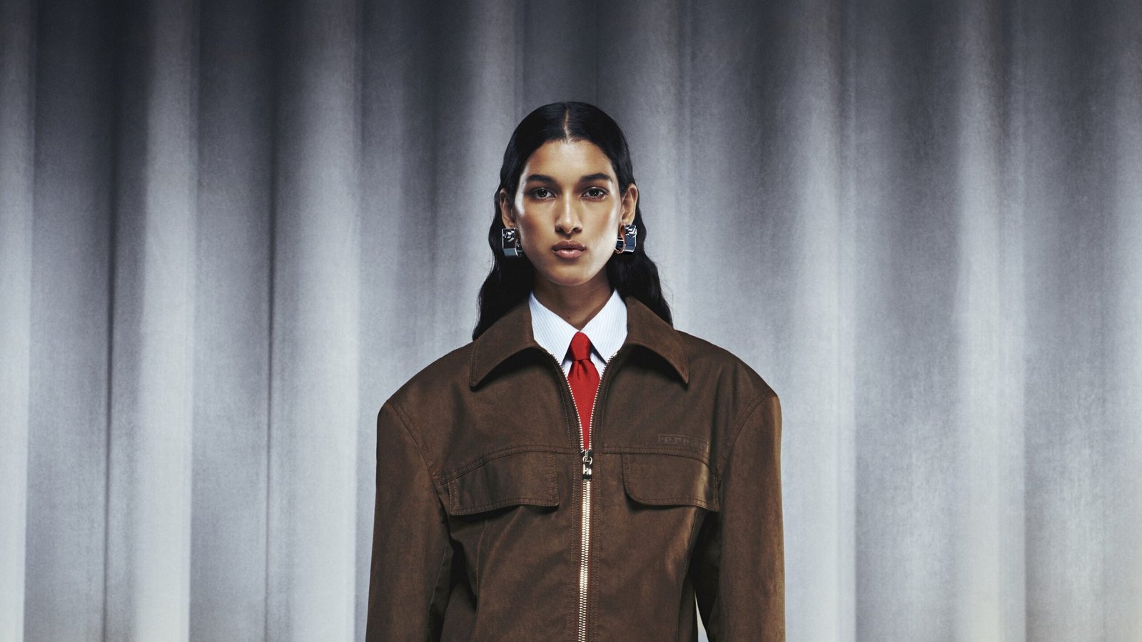 The opening looks are inspired by engineers working in business- and science-oriented areas, with sartorial looks made of coated denim trench coats and leather separates, often matched with Ferrari-red ties. References to the automotive world are recurring but always subtle, such as the car silhouette evoked through the shape of zips or the shoulders of leather bikers and blousons with integrated spoilers that clearly recall those found on Ferraris. Sometimes, instead, actual car parts become the main materials; as is the case with discarded Ferrari tires that have been transformed into a yarn used for knitwear and iridescent suits—a copyrighted fabric called Q-Cycle—in an innovative approach to circular creativity.