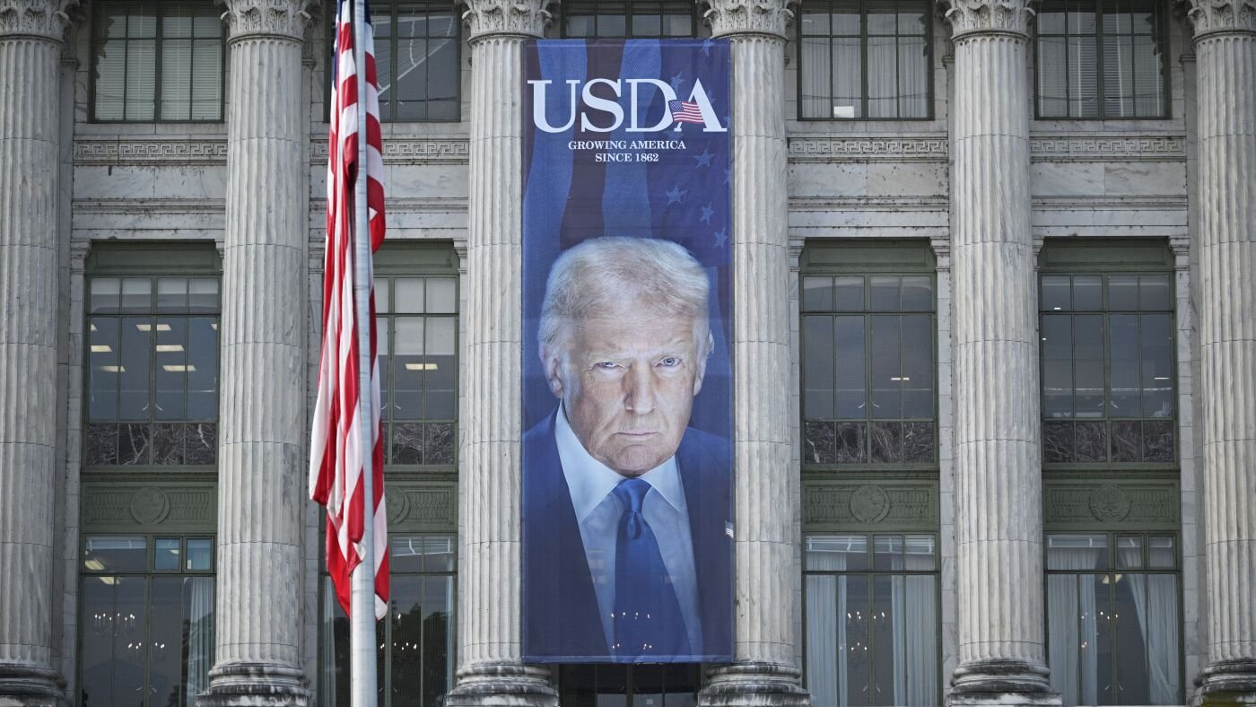 A banner showing an image of President Trump hangs on the side of the U.S. Department of Agriculture building in Washington, DC. The department wants states to turn over records about tens of millions of people who have received federally-funded nutrition assistance by July 30.