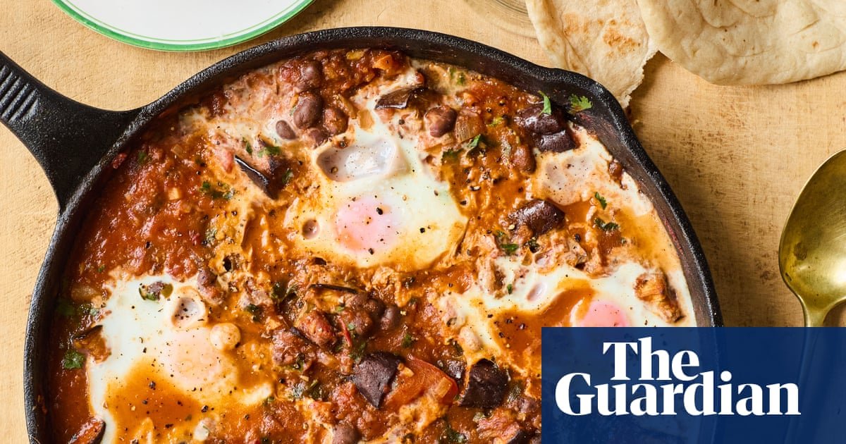 Add the aubergine chunks and cook for a further three minutes. Stir in the coriander, then turn down the heat to medium-low. Make four wells in the sauce and crack an egg into each well. Gently swirl the egg whites with a fork a little bit, taking care not to break the yolks. Simmer gently for seven or eight minutes, until the egg whites are set and the yolks are still runny. Cover the pan with a lid for the last few minutes, to speed things up.