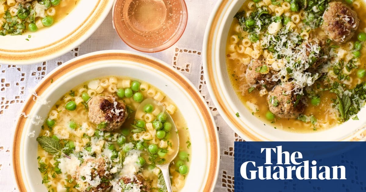 Add the stock to the pan and bring to a boil. Stir in the pasta and peas, then bring back to a boil and simmer for five to seven minutes, until the pasta is tender and the meatballs are cooked through. Off the heat, stir in the lemon juice, then taste the broth and adjust the seasoning as needed. Finish by stirring in the remaining herbs and serve topped with the grated pecorino.