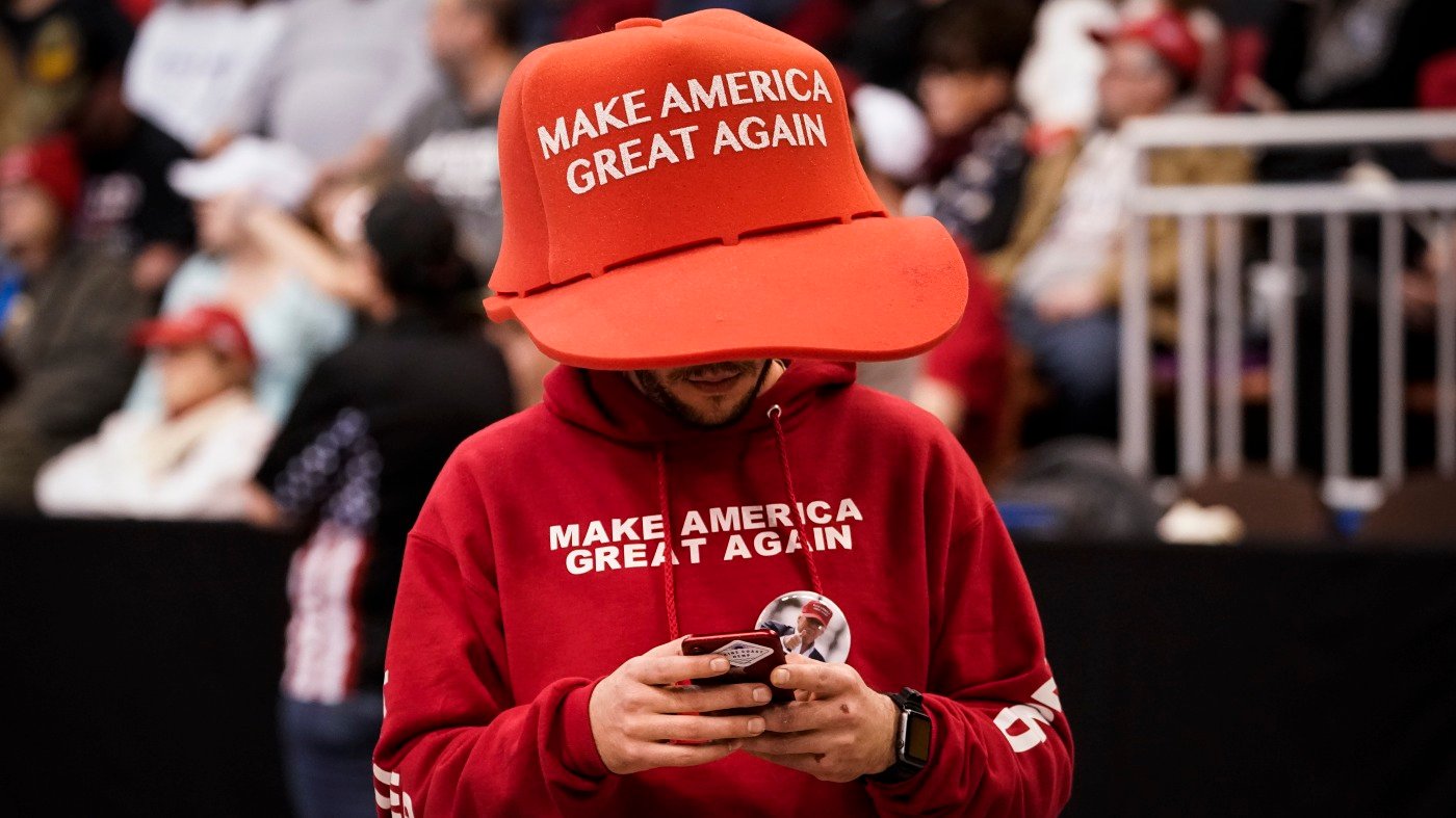 A supporter of President Trump wears an oversize “Make America Great Again Hat” at a rally at Southern New Hampshire University Arena on Feb. 10, 2020, in Manchester, N.H. Trump narrowly won young men last fall, a 12-point shift from four years earlier when Biden won the group by 11 percentage points.
