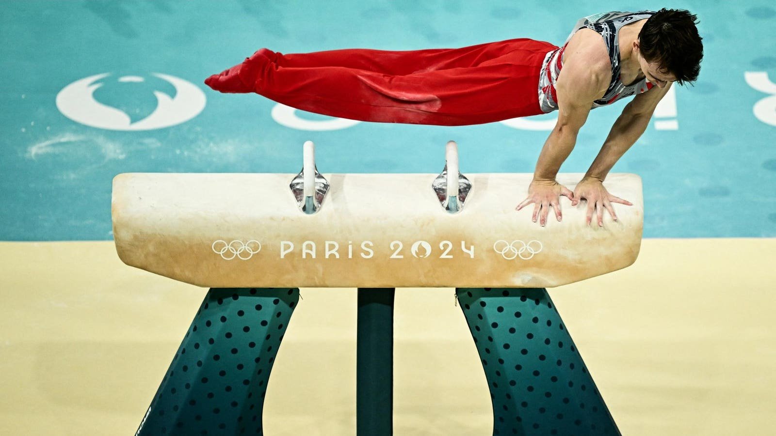 TOPSHOT – US’ Stephen Nedoroscik competes in the pommel horse event of the artistic gymnastics men’s team final during the Paris 2024 Olympic Games at the Bercy Arena in Paris, on July 29, 2024. (Photo by Loic VENANCE / AFP) (Photo by LOIC VENANCE/AFP via Getty Images)