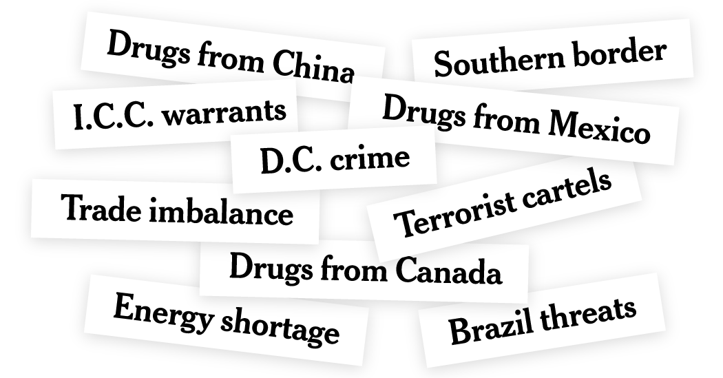The most recent category is a trade imbalance. In an April executive order declaring a national emergency, Mr. Trump cast “large and persistent annual U.S. goods trade deficits” as a national security and economic threat. That emergency declaration has been cited to justify at least nine actions since then, some of them encompassing changes to tariff rates for many trading partners at once.
