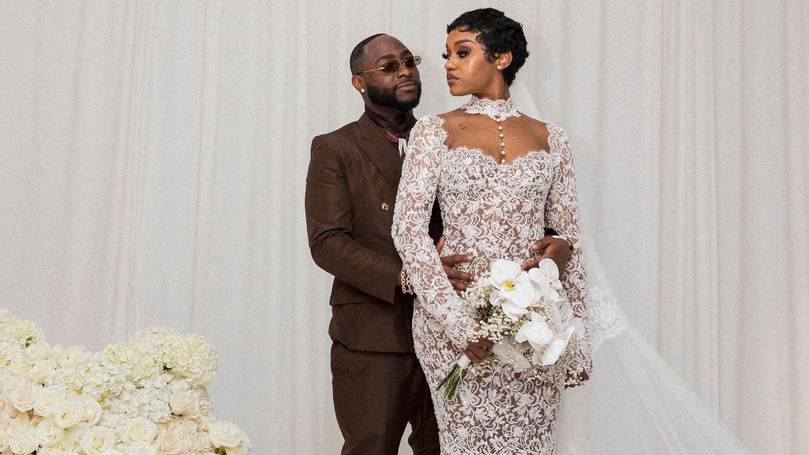 After a Havana night-themed welcome party at Queen Miami, Chioma met Davido under a white floral arch at Mana Wynwood in Miami as 1,500 guests looked on. She wore an ornate wedding dress by Alonuko, a London-based bridal brand founded by a British-Nigerian designer. “I worked with my stylist, Tosin Agboola from The Wardrobe Manager, to coordinate all my looks. We wanted everything to feel cohesive, elevated, and true to both the Miami setting and the overall vision of the wedding. It was also important to include Nigerian designers alongside international names,” she says. The musician, meanwhile, wore a brown Tom Ford suit and diamonds from his personal collection, as styled by Yasmeen Ntwari. “I felt at peace,” Davido says of the ceremony. “I got to marry the love of my life and I get to wake up next to her forever.” Both bride and groom also wore poignant mementos of their late son, Ifeanyi.