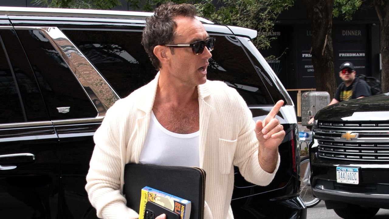 On Tuesday, Law was spotted outside his hotel in New York City dressed like he was about to board a yacht to sail somewhere beachy and tax-free. In his hand, he carried a laptop, a phone, and a paperback copy of Jim Steinmeyer’s Hiding The Elephant; on his person, he swathed himself in soft clothing in shades of white and cream.