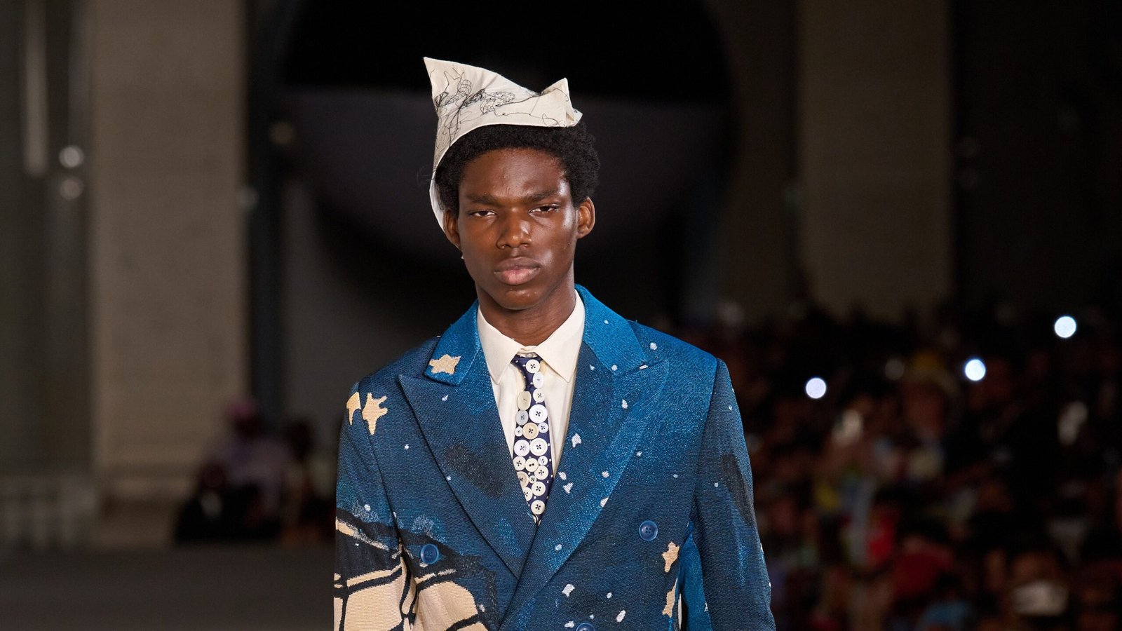 At one point during the show I chuckled thinly when realizing that almost the entire audience (me included) had raised smartphones to video a show about the magic of print. The tailoring-led collection featured many illustrations drawn from and inspired by Dillane’s book, as well as book bags aplenty. There were a pant and shirt that looked like a bottom drawer novel, patterned with intense cursive and furious scribble. There were paper hats, a pencil with a bag strap, and pencils worn as ties, but sadly no typewriters. Pieces that looked to reference Dillane’s back catalogue of chapters were dedicated to painting, puppets, unravelling whatever semi-apocalyptic topic last season’s weather event was about, and the imaginative process. A very literal flower hat was a funny piece worn above a very handsome embossed leather overcoat. You could see from the differing quality and feel of the pieces that parts of the collection had been ghosted by different collaborators with varying specialisms. The closing look was worn by the mercurial Italian soccer star Mario Balotelli, a casting that reflected another of Dillane’s abiding passions.
