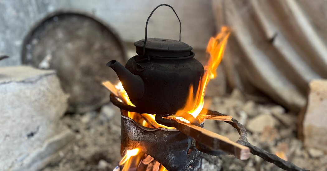Since the war began, we ration everything: food, water, light. Now that the fuel is gone, we cook on a wood fire. Anything becomes kindling: broken pallets, torn blankets, old plastic sandals, empty cheese cartons, plastic jars. Now, when we make saj flatbread, we slide a teapot into the fire to use the heat from the flames twice. Most homes have the same setup: a big empty pickle or bean tin punched with air holes for a stove; a small bean can for a heater. All of us have burns on our hands and the black stain of smoke in our nails.