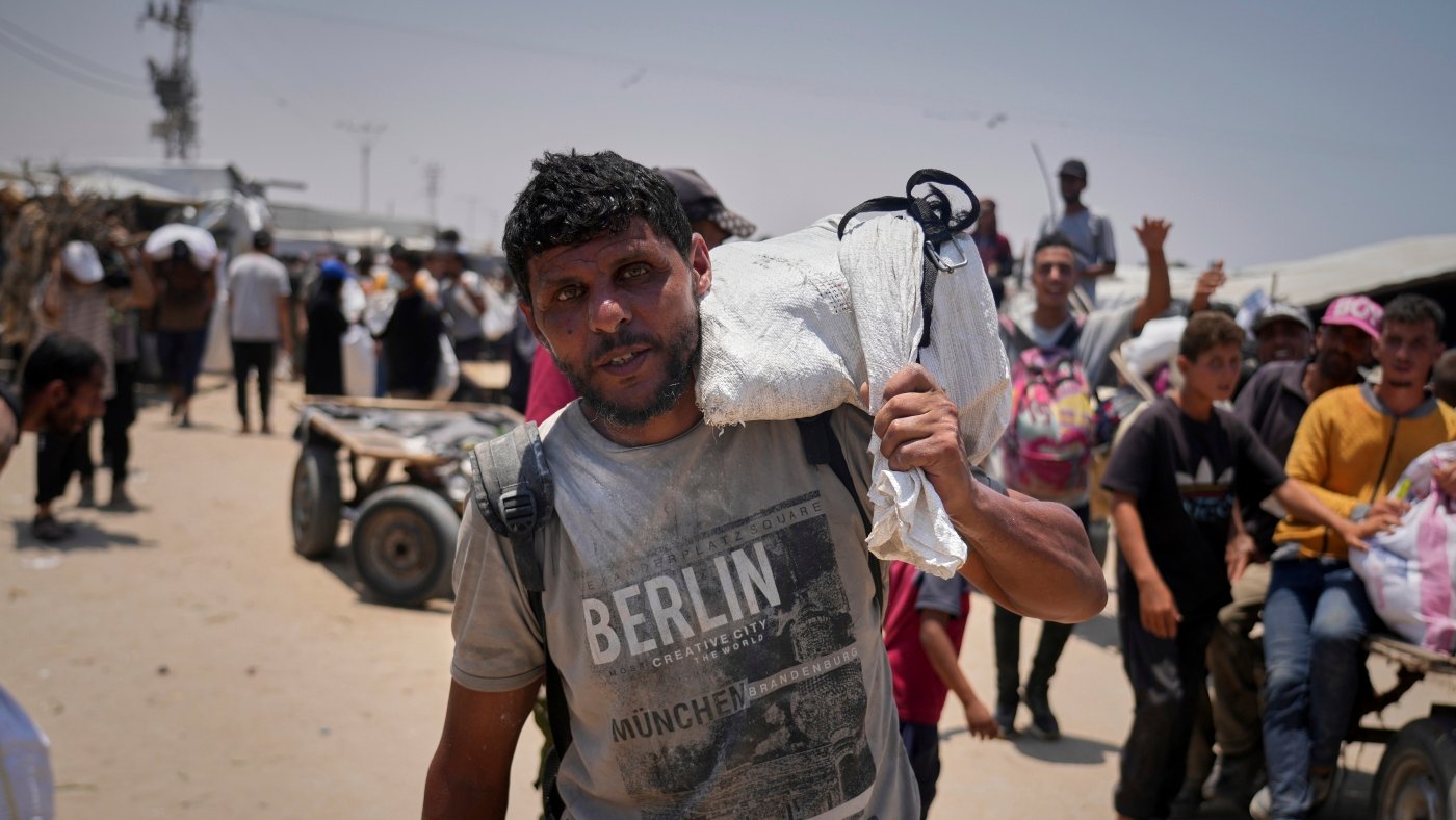 Omar al-Hobi, 43, from Rafah, carries a bag of food he collected at a distribution center run by private contractor the Gaza Humanitarian Foundation in the southern Gaza Strip, as he arrives at his tent in Khan Younis, on June 10.