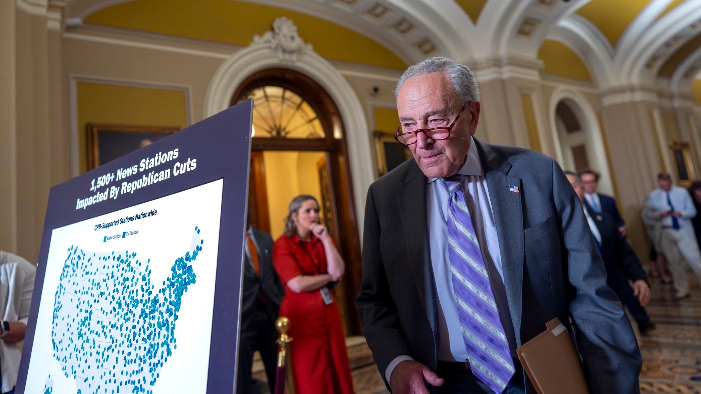Senate Minority Leader Chuck Schumer, D-N.Y., arrives to speak with reporters about Senate Republicans’ efforts to claw back $1.1 billion of funding authority from the Corporation for Public Broadcasting and about $8.3 billion from foreign aid programs targeted by DOGE, at the Capitol in Washington, Tuesday, July 15, 2025.
