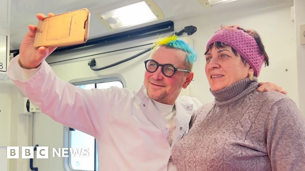 Serhii BaksheievIn a rural village close to the Ukrainian front line, a group of women queue quietly outside a purple and white ambulance, waiting to be seen by a doctor with his shaved head dyed the blue and yellow of the Ukrainian flag.
