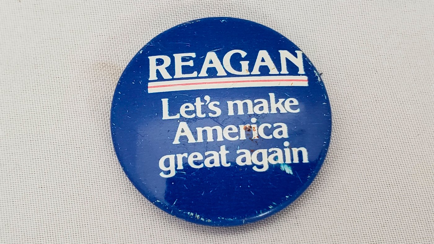 Close-up photo of pinback button with text reading Reagan, Let’s Make America Great Again, for Ronald Reagan’s 1980 presidential election campaign.