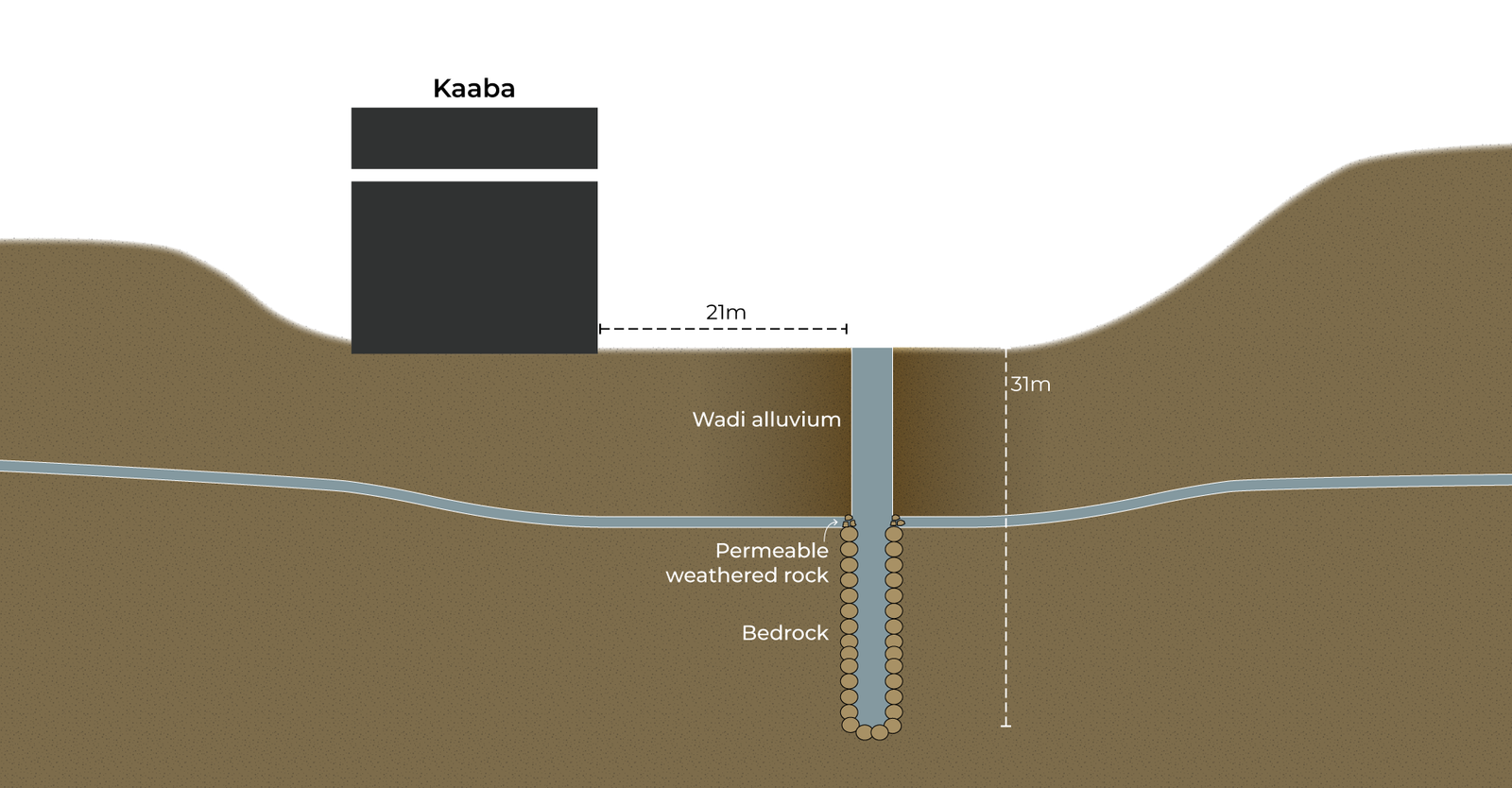 The Zamzam well is about 31 metres (101 feet) deep and was originally hand-dug. Water enters the well through loose sand and gravel in the top part, and also from cracks in the solid rock below.