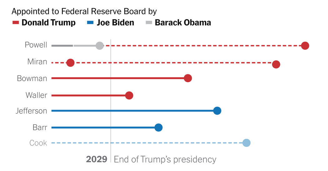 When President Trump took office in 2025, just two of the seven seats on the Federal Reserve’s Board of Governors were held by his appointees. He had also elevated Jerome H. Powell to the chair position during his first term.