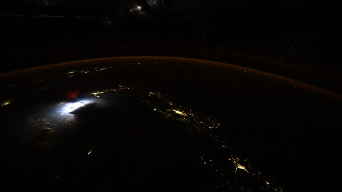 But wait, there’s more! The lightning strike is so bright that its reflection can be seen in the space station’s structure, at the top of the image. Additionally the atmosphere’s airglow can be clearly seen in the orange line just above the atmosphere.