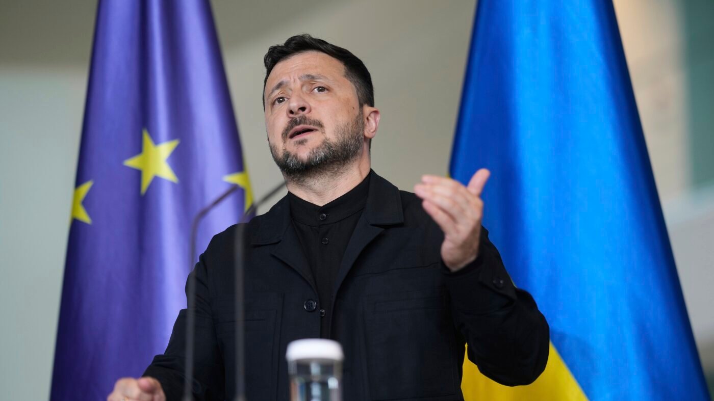 Ukraine’s President Volodymyr Zelenskyy gestures during a news conference at the chancellery in Berlin, Germany, Wednesday, May 28, 2025.