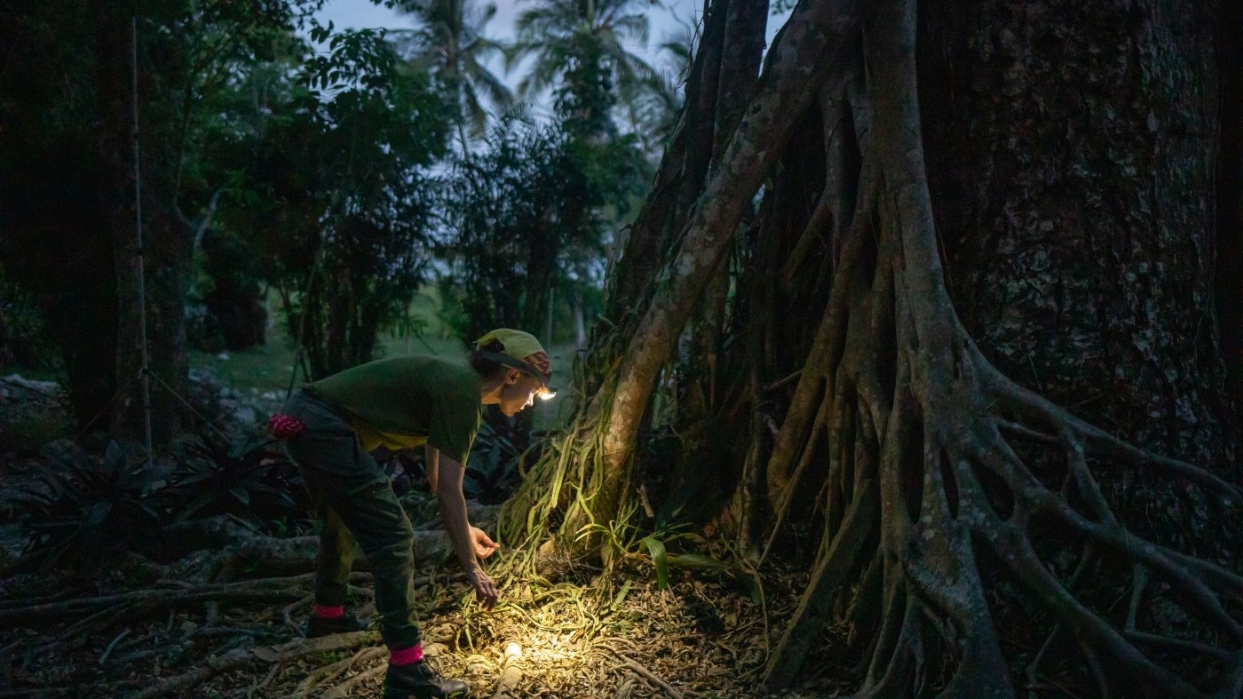 Teri Orr, a physiological ecologist at New Mexico State University, inspects the base of a guanacaste tree in Belize where she intends to trap bats later in the night. Scientists say they’ve developed an alternate method of tracking biodiversity that relies on the DNA that animals release into the environment, known as eDNA.