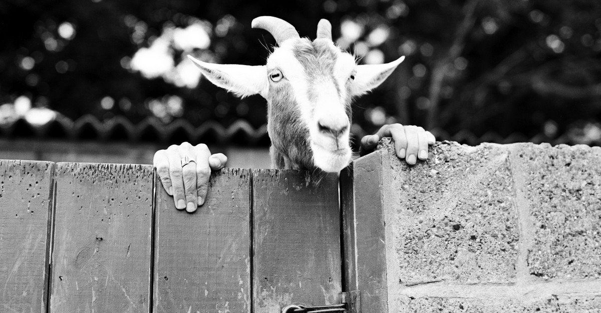 Chad the goat peers over a gate and is flanked by human hands, at Chessington Zoo, in greater London, on July 15, 1970.