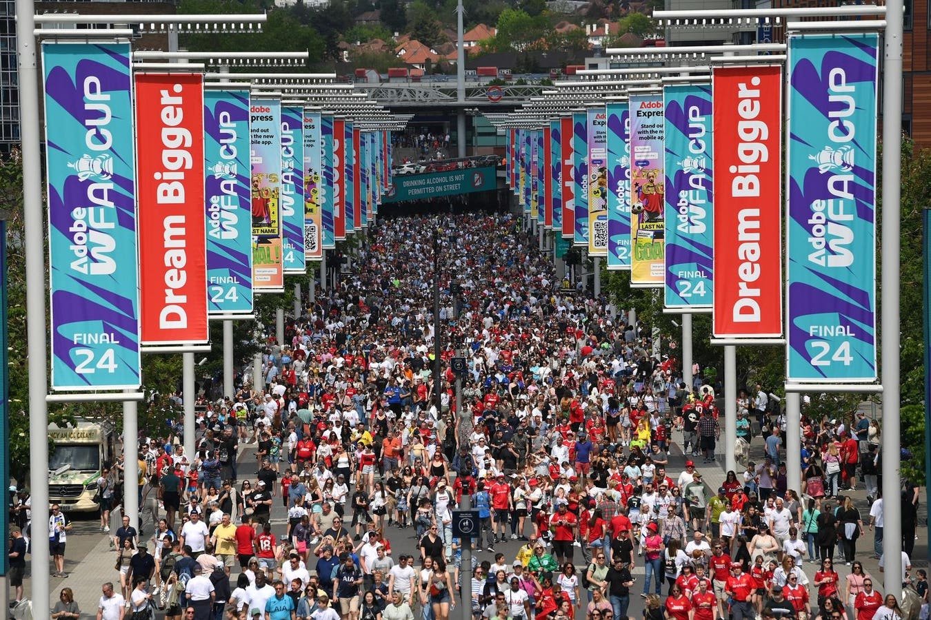 LONDON, ENGLAND – MAY 12: Fans walk down Wembley Way as they arrive at the stadium prior to the … More